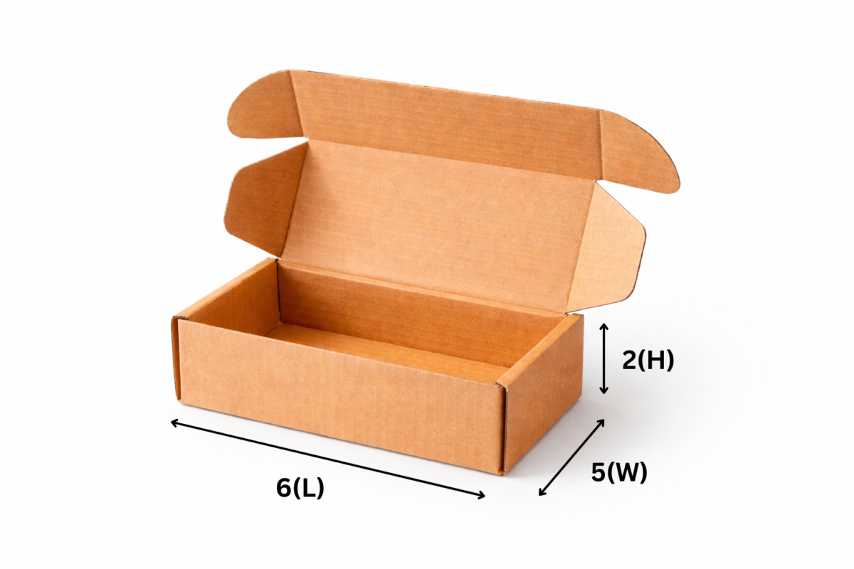 Durable 3 Ply brown corrugated flap / mailer box (6x5x2 inches) for e-commerce, courier & shipping. Compact size perfect for jewellery, accessories, skincare & lightweight items. Eco-friendly carton for online sellers.
