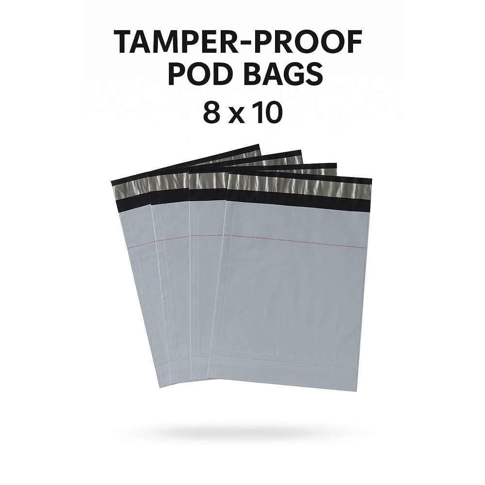 Tamper proof 55 micron POD courier bag (8×10 inches) with strong adhesive flap and invoice jacket. Perfect for small apparel, documents & accessories. Widely used by Amazon, Flipkart, Meesho & D2C sellers for e‑commerce packaging & shipping.