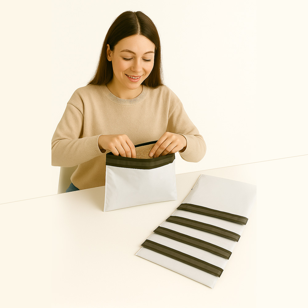 SecureShip® Tamper‑Proof Meesho Courier Bag with Transparent Jacket – 55 Microns, White‑Black (Extra Large Courier Bag, 16×20 in). Features a secure adhesive flap and transparent invoice jacket—ideal for Amazon, Flipkart & online sellers.